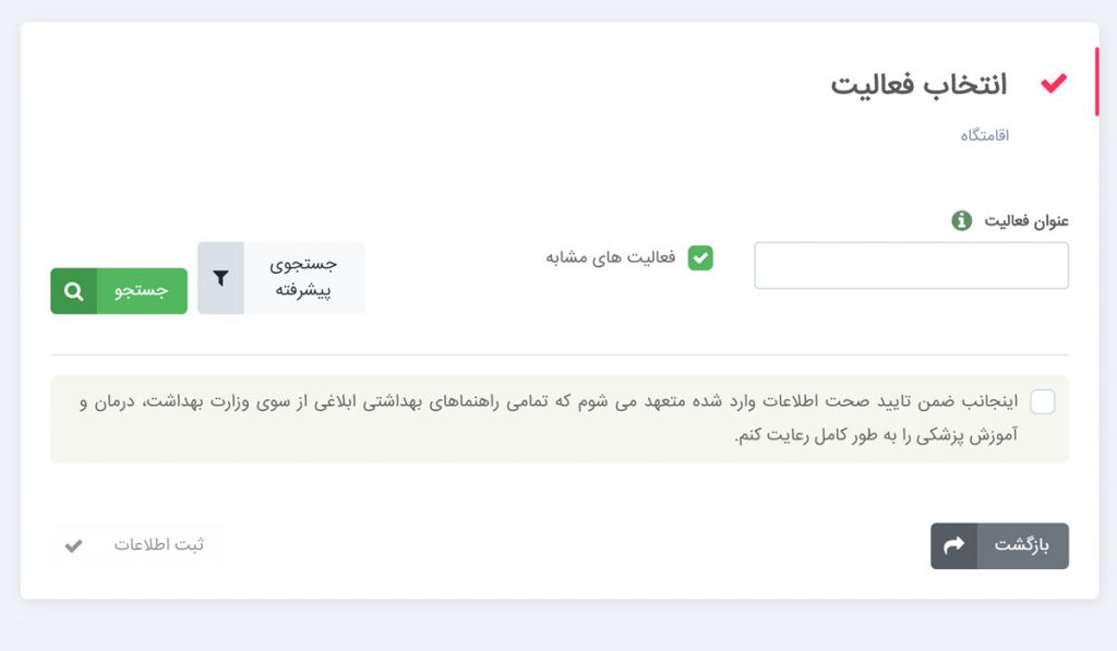 در این مرحله پس از کلیک بر گزینه جستجوی پیشرفته، فعالیت واحد اقامتی خود را در سطح 1، فعالیتهای خدماتی مربوط به تامین جا و غذا و در سطوح بعدی مطابق با تصاویر زیر انتخاب کرده و بر روی گزینه ثبت اطلاعات کلیک کنید.