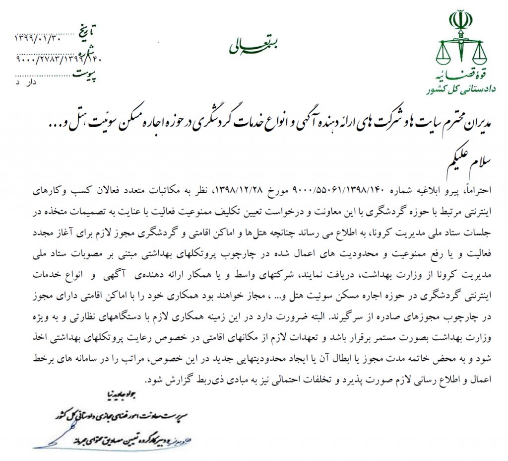 با استناد به ابلاغیه دادستانی محترم کشور، امکان رزرو آنلاین برای آن دسته از اقامتگاههایی که موفق به کسب مجوز بهداشتی لازم از سوی وزارت بهداشت شدهاند، بر روی سایت جاباما فعال شدهاست. در این مطلب راهنمای جدید دریافت مجوز بوم گردی و ثبت اقامتگاه در دوران کرونا را میخوانید.