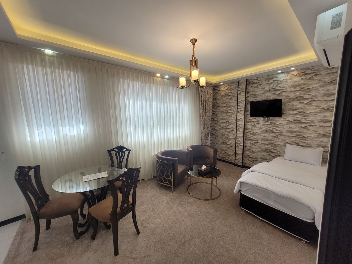 این واحد مبله یکخوابه در طبقه چهارم یک ساختمان ۴ طبقه ۱۲ واحدی دارای آسانسور و پارکینگ مسقف با فاصله حدود ۲ کیلومتری از حرم امام رضا در شهر مشهد واقع شده است.