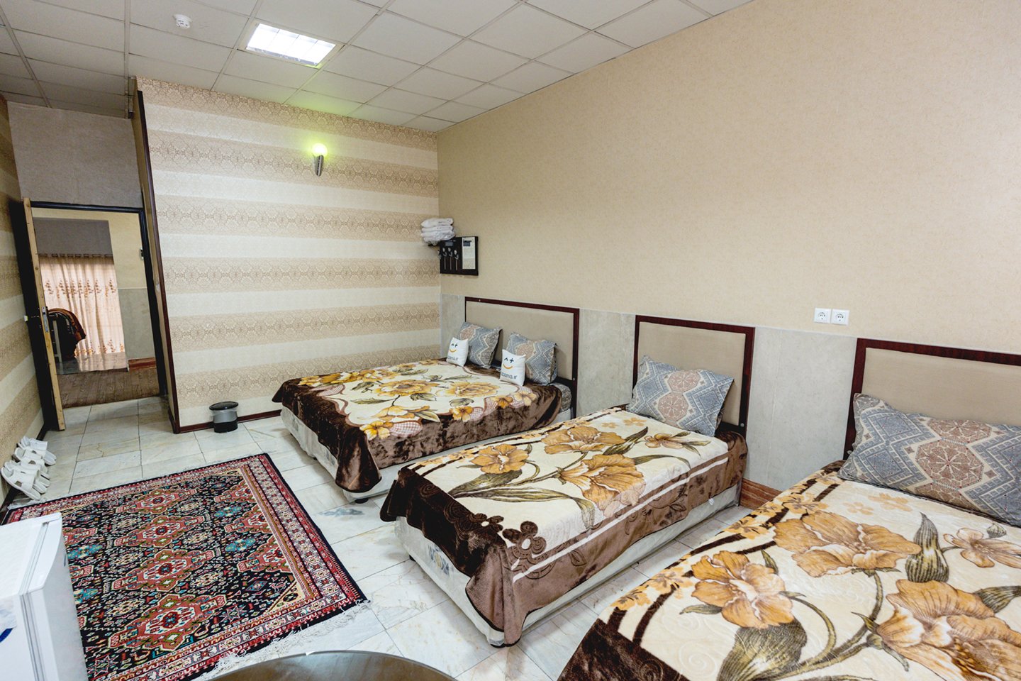 بوی سیگار و بوی کهنگی کل اتاق گرفته بود. در کل اصلا راضی نبودیم .اتاق ۱۵ متری برای ۴ نفر!!!!