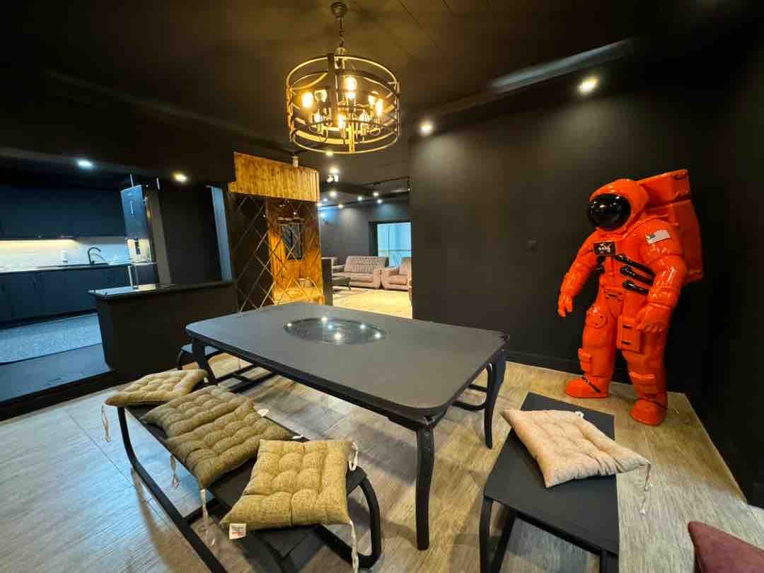 با سلام دیوارها رنگ سیاه بودند حتی اسپلیت و شوفاژها که با توجه به پنجره نداشتن پذیرایی احساس بدی میداد همینطور صدای فن مجموعه آبی خیلی اذیت کننده بود